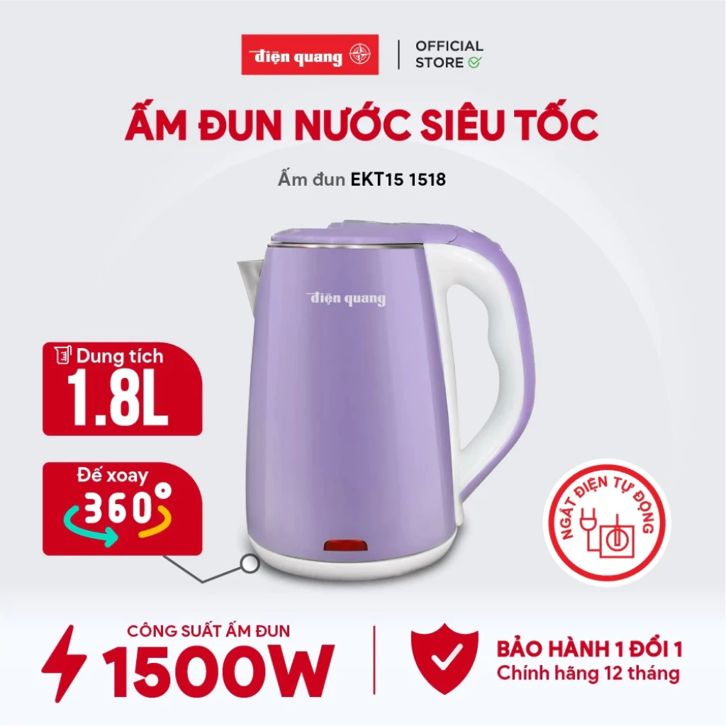 Ấm đun nước siêu tốc Điện Quang ĐQ EKT15 1518 là vật dụng không thể thiếu trong mỗi gia đình. Thiết kế sang trọng, dung tích lớn 1.8L, chất liệu Inox 201 cao cấp bền đẹp, mang đến sự an toàn và tiện lợi cho sinh hoạt hằng ngày như pha trà, pha sữa, nấu mì…