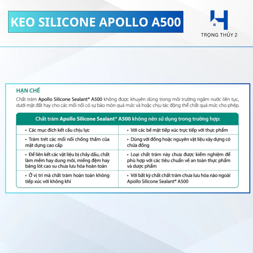 Không nên dùng cho môi trường yêu cầu kháng nhiệt hoặc kháng tia UV cao (nên dùng keo chuyên dụng)