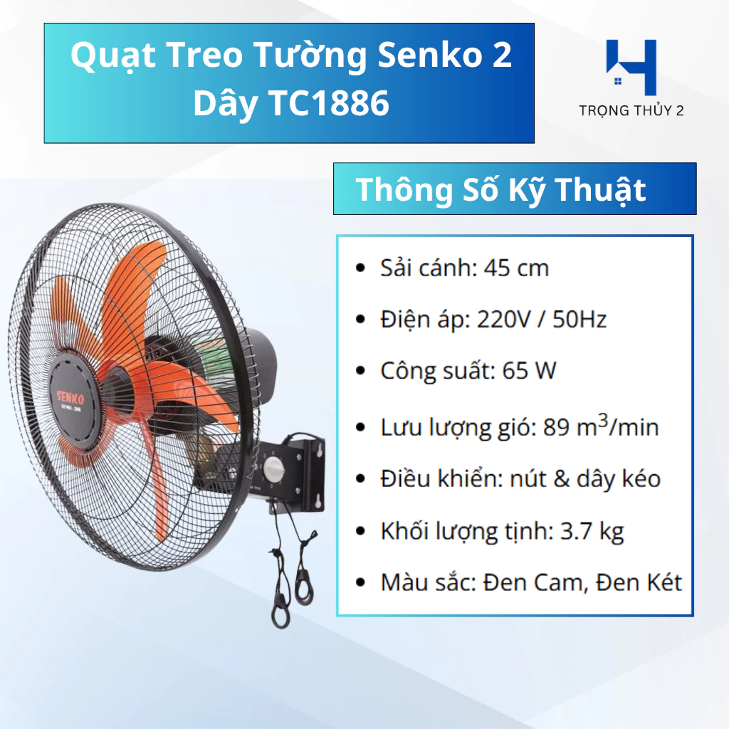 Quạt treo tường Senko TC1886 là dòng quạt công nghiệp mạnh mẽ, phù hợp sử dụng trong nhà xưởng, quán ăn, cửa hàng hoặc không gian rộng cần lưu thông gió tốt.